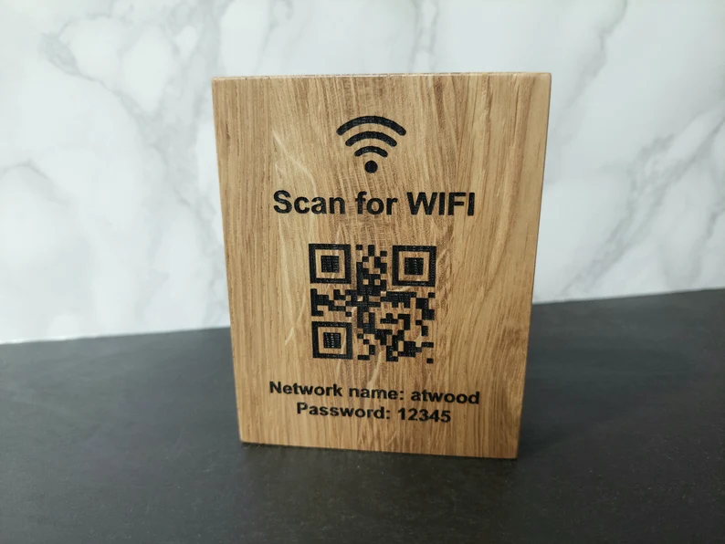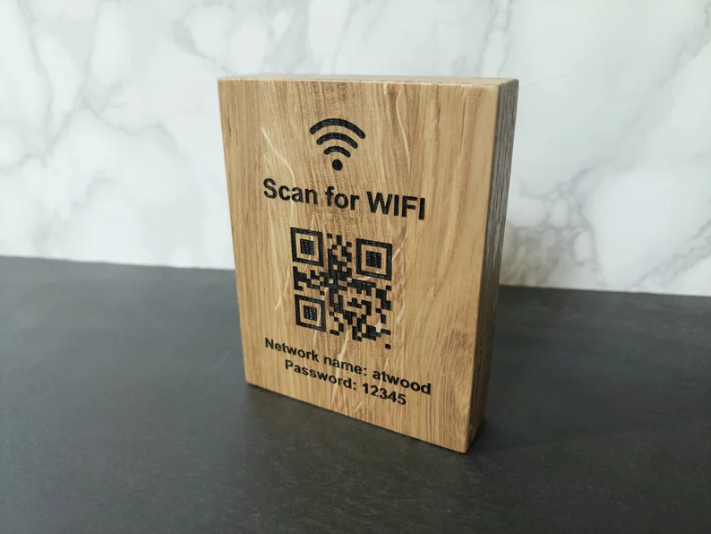 Αναβαθμίστε την εμπειρία των επισκεπτών σας με τον εξατομικευμένο κωδικό QR για Wi-Fi, χαραγμένο σε ξύλινο ταμπελάκι υψηλής ποιότητας, όπως το βλέπετε στην φωτογραφία. Αυτή η κομψή και λειτουργική πλακέτα κωδικού QR έχει σχεδιαστεί για να απλοποιήσει την πρόσβαση στο Wi-Fi για τους καλεσμένους σας, ενώ ταυτόχρονα προσφέρει μια όμορφη και μοντέρνα προσθήκη στη διακόσμηση του καταλύματος ή της επιχείρησής σας.